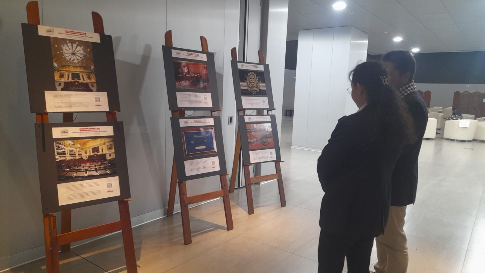 Parlamentarios internacionales que participan en la Conferencia Mundial de Jóvenes Parlamentarios aprecian la exposición fotográfica sobre la historia del Congreso de la República a cargo del Archivo Fotográfico del Congreso, en el Centro de Convenciones de Lima.
