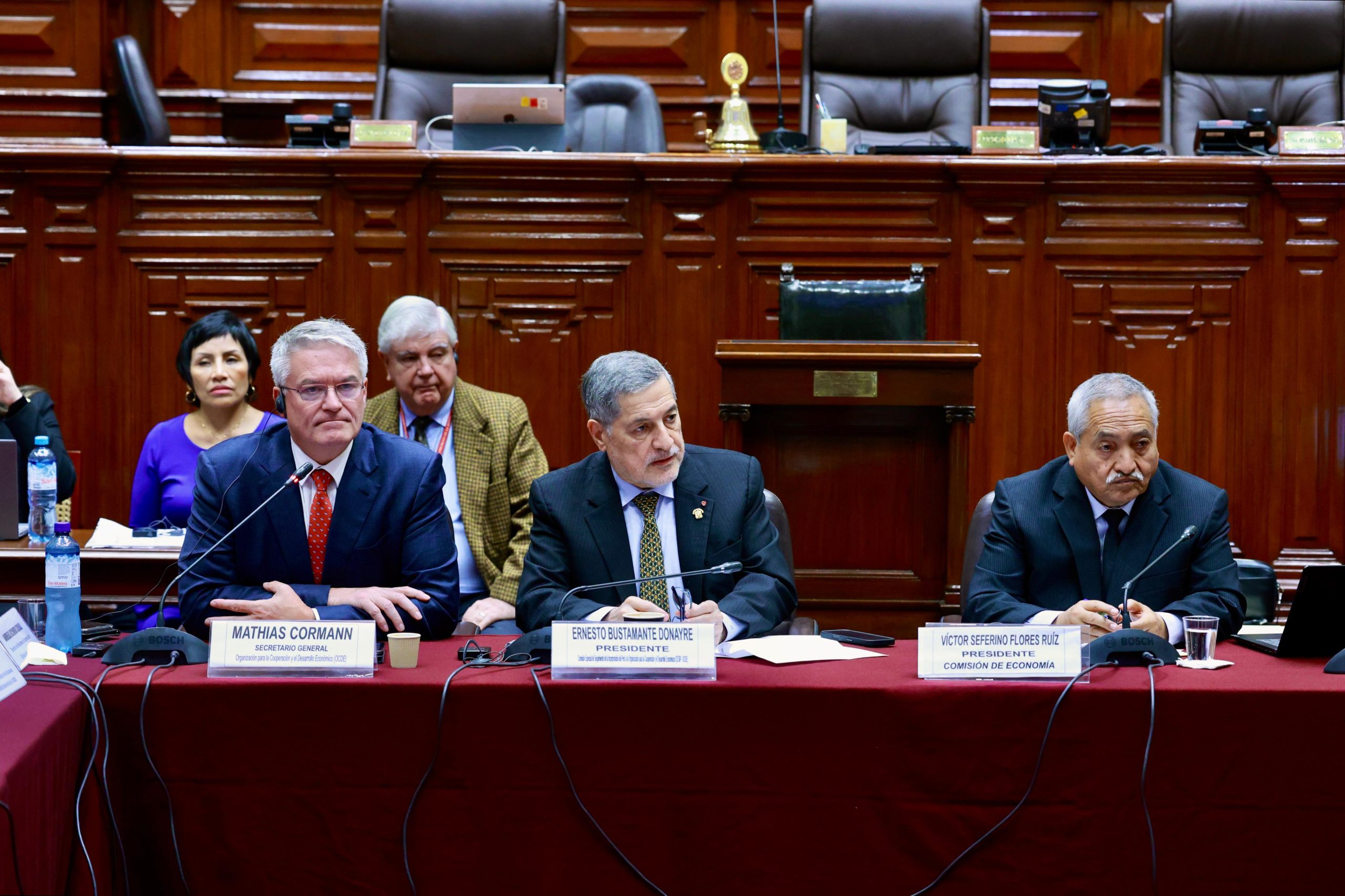 El congresista Víctor Flores, presidente de la Comisión de Economía, y el congresista Ernesto Bustamante, presidente de la Comisión Especial CESIP-OCDE, tienen en agenda la presentación del «Estudio económico del Perú», a cargo de Mathias Cormann (OCDE). (Congreso de la República/JReátegui)