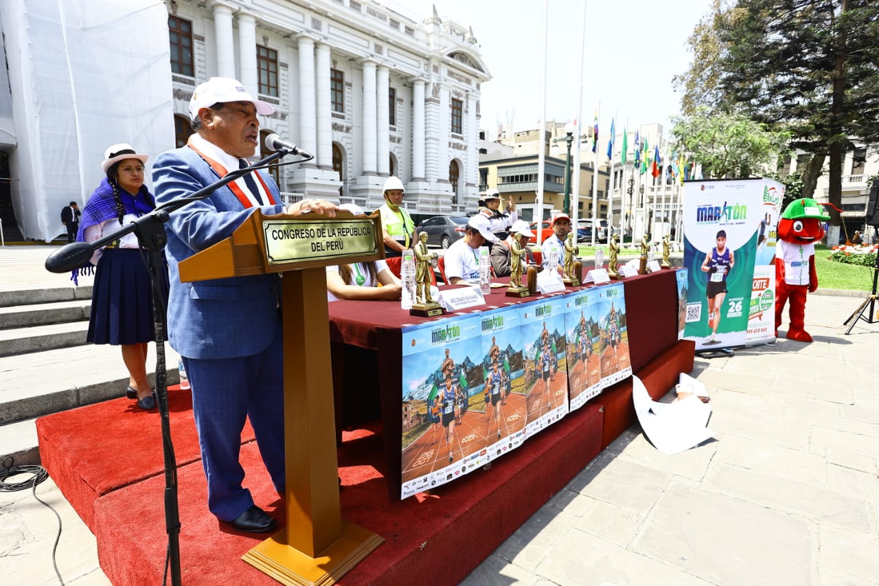 El congresista Pasión Dávila participa en el evento «Lanzamiento oficial de la Maratón Internacional Meseta de Bombón», organizado por su despacho en la Plaza Constitución (antes plaza Simón Bolívar). (Congreso de la República/VVásquez)