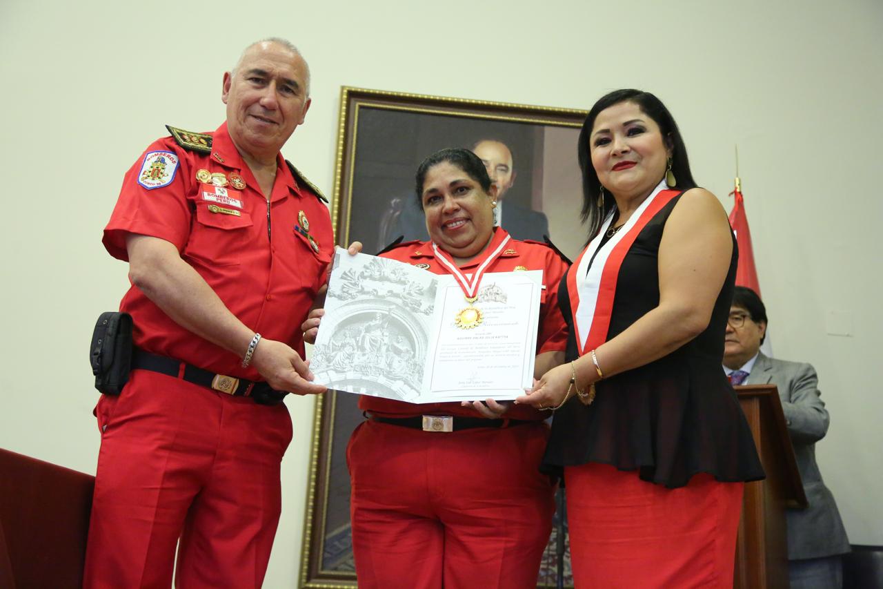 La congresista Jeny López brindó un reconocimiento a los integrantes de la Compañía de Bomberos Voluntarios del Perú, promoción “Brigadier Mayor CBP Alfredo Vinazza Cecchi”, por sus 25 años de servicio al país, resaltando su valentía, disciplina y destacada vocación de servicio. (Congreso de la República/JCSánchez)