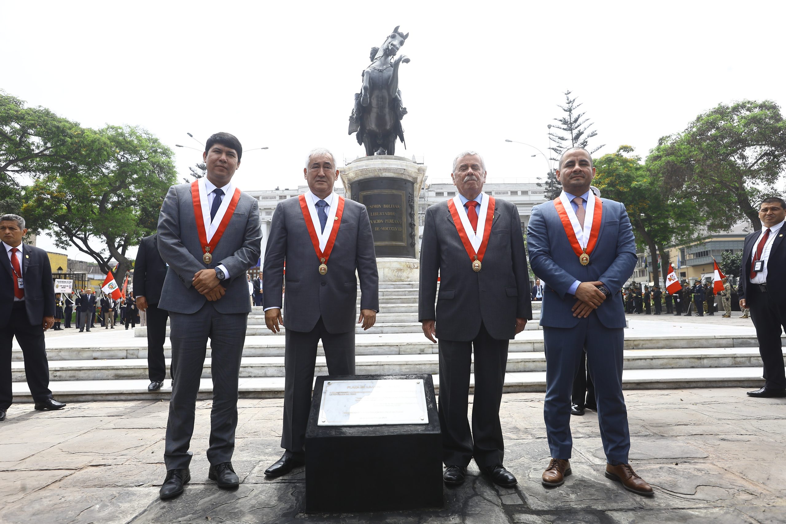 El vicepresidente encargado de la Presidencia del Congreso, Fernando Rospigliosi, acompañado de los parlamentarios Arturo Alegría, Eduardo Castillo y José Luis Elías Avalos develan la placa con el nombre oficial de la plaza. También se inaugurará una exposición fotográfica con imágenes históricas de las distintas constituciones peruanas. (Foto: Congreso de la República/ VVásquez)