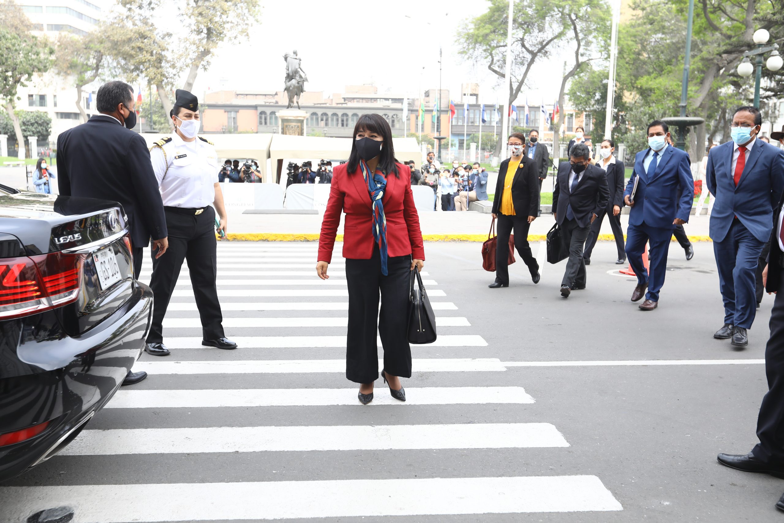 La presidenta del Consejo de Ministros, Mirtha Vásquez, y el equipo ministerial llegan al Congreso para participar en la sesión del Pleno convocada con el fin de reanudar el debate sobre el voto de confianza. (Foto: Congreso de la República/V. Vásquez) Ver vídeo