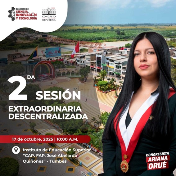 La Comisión de Ciencia, Innovación y Tecnología del Congreso de la República, que es presidida por la congresista Ariana Orué, llevará a cabo su Segunda Sesión Extraordinaria Descentralizada en el Instituto de Educación Superior “CAP. FAP. José Abelardo Quiñones” de Tumbes, con el objetivo de promover la articulación entre el Estado, la academia y los gobiernos locales en torno al fortalecimiento de la investigación, la innovación y la tecnología en la región.