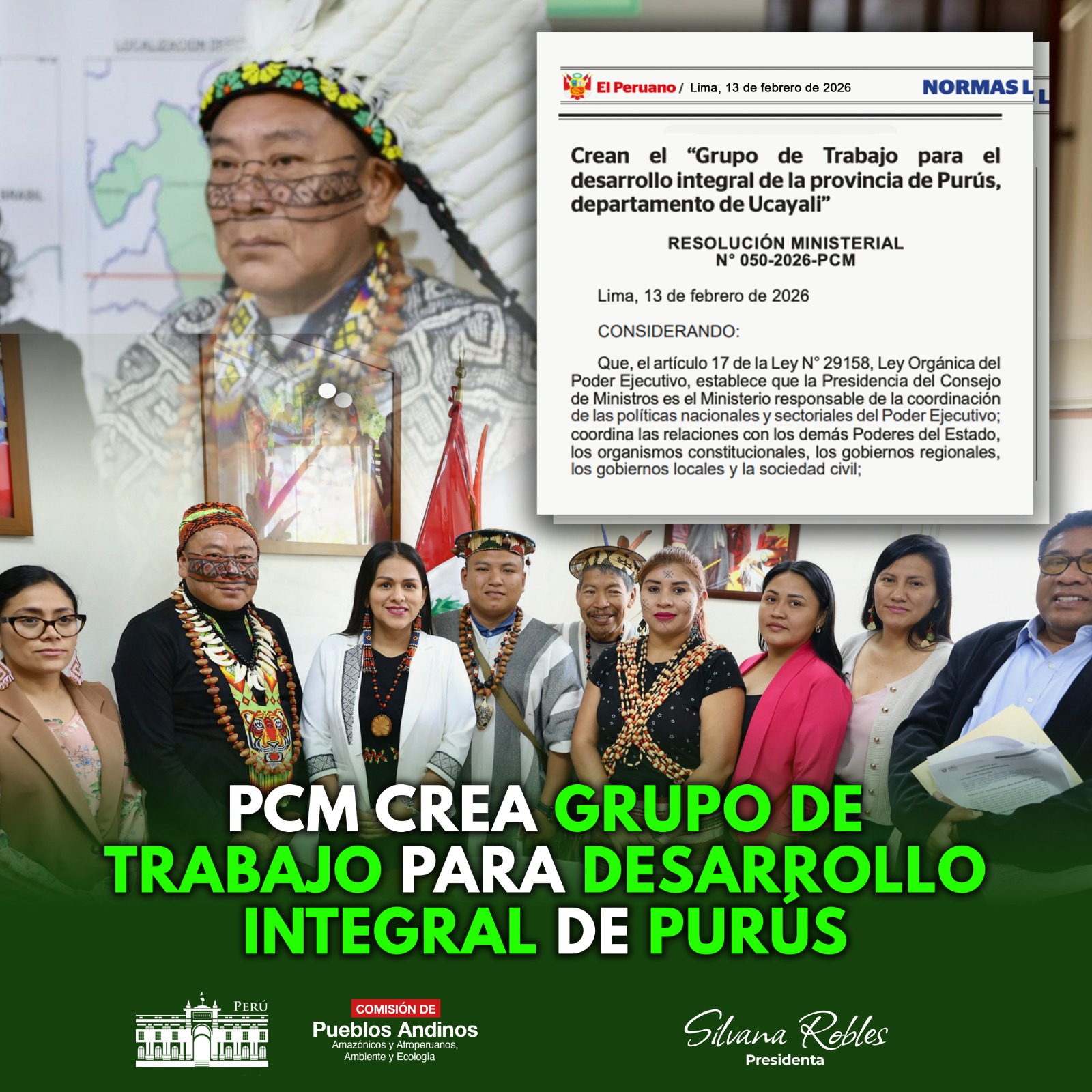 La Comisión de Pueblos Andinos, Amazónicos y Afroperuanos, Ambiente y Ecología del Congreso de la República, presidida por la congresista Silvana Robles, saluda la creación del “Grupo de Trabajo para el desarrollo integral de la provincia de Purús, departamento de Ucayali”, dependiente de la Presidencia del Consejo de Ministros, conforme a la Resolución Ministerial N° 050-2026-PCM.