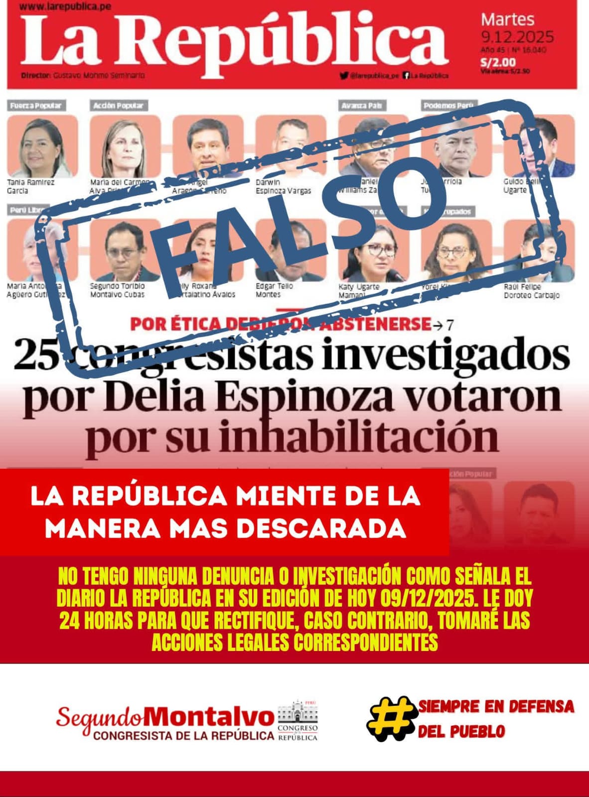 Agregó que “la publicación constituye un claro acto de desinformación orientado a afectar mi imagen como congresista elegido democráticamente, precisamente en un contexto en el que ejerzo mi derecho al voto en el proceso de inhabilitación de la ex fiscal de la Nación”.