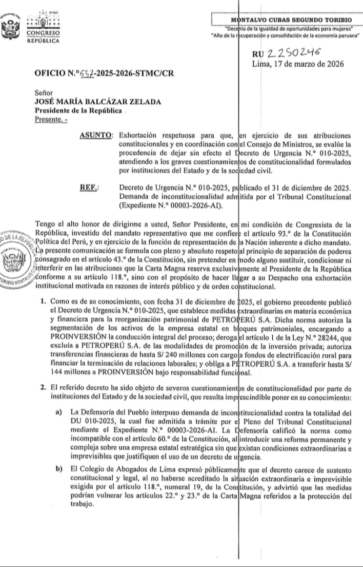 De acuerdo al documento presentado, el legislador representante de la región Amazonas formula una “exhortación respetuosa para que, en ejercicio de sus atribuciones y en coordinación con el consejo de ministros se evalúe la procedencia de dejar sin efecto el decreto de urgencia 010-2025, atendiendo a los graves cuestionamientos de constitucionalidad formulados por instituciones del estado y de la sociedad civil”.
