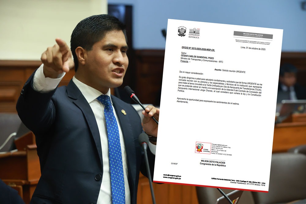 El congresista Wilson Soto Palacios envió el Oficio N.° 0215-2025-2026-WSP-CR al ministro de Transportes y Comunicaciones, César Carlos Sandoval Pozo, solicitando una reunión de carácter URGENTE para abordar el polémico cobro de la Tarifa Unificada por Uso de Aeropuerto (TUUA) de transferencia.
