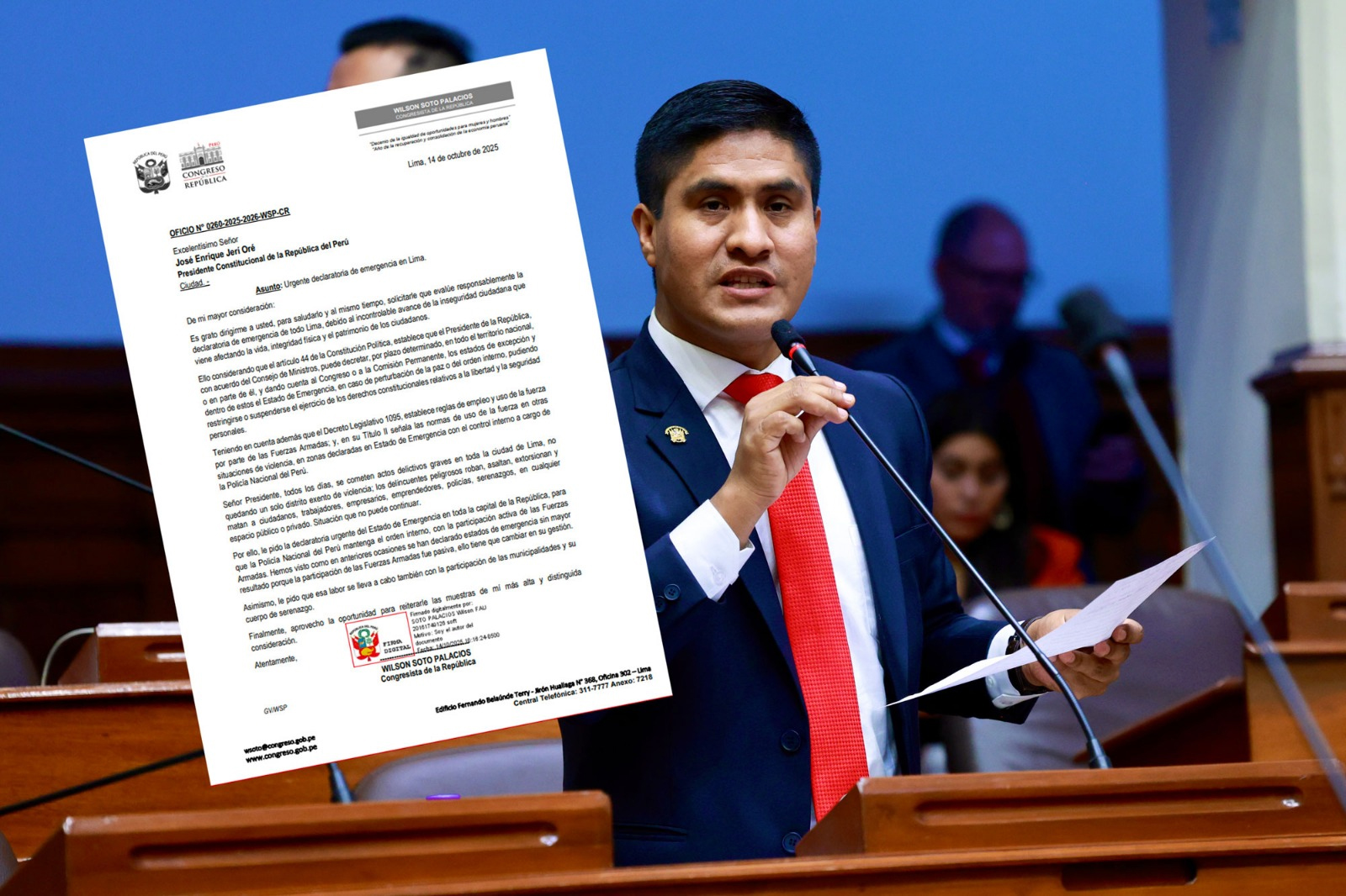 El congresista Wilson Soto Palacios solicitó formalmente al Presidente de la República, José Enrique Jerí Oré, la declaratoria de Estado de Emergencia en toda la ciudad de Lima, ante el incremento descontrolado de los delitos que ponen en riesgo la vida, la integridad y el patrimonio de millones de ciudadanos.