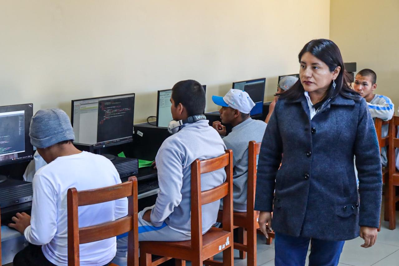 La visita se realizó junto a René Lorenzo Espinoza Cervantes, director del Centro Juvenil Alfonso Ugarte, con quien Esmeralda Limachi sostuvo una reunión de trabajo para evaluar la situación del centro, el acceso a la educación, los programas de capacitación y el acompañamiento psicosocial que reciben los adolescentes.