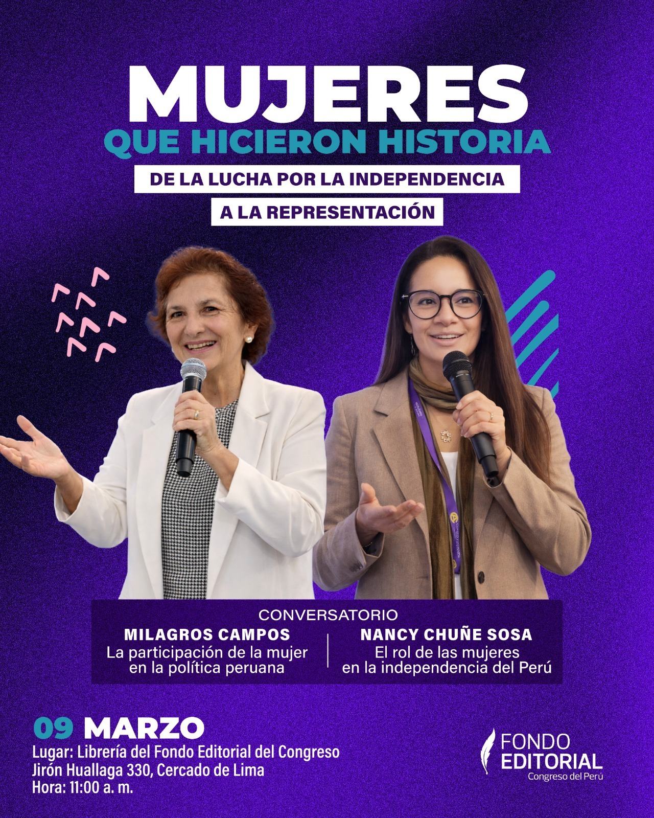 En el marco del Día Internacional de la Mujer, el Fondo Editorial del Congreso (FEC) realizará el conversatorio “Mujeres que hicieron historia: de la lucha por la independencia a la representación”, el próximo lunes 9 de marzo.