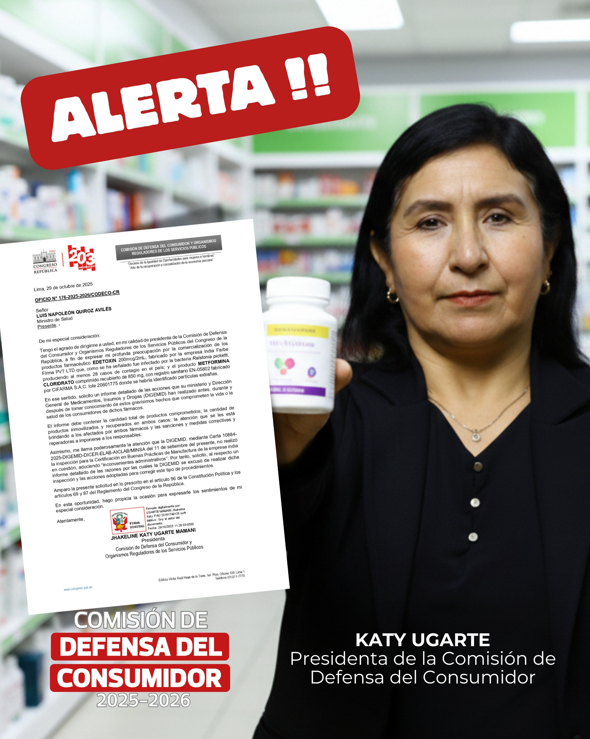 La presidenta de la Comisión de Defensa del Consumidor, Katy Ugarte Mamani, expresó su profunda preocupación ante las recientes alertas sanitarias que involucran a los medicamentos EDETOXIN 200 mcg/2 mL, fabricado por la empresa india Farbe Firma PVT LTD, y Metformina Clorhidrato comprimido recubierto de 850 mg, con registro sanitario EN-05802 de CIFARMA S.A.C., lote 20601775. Ambos productos habrían sido distribuidos en el país, en las que se habrían detectado que presentan graves riesgos para la salud pública.