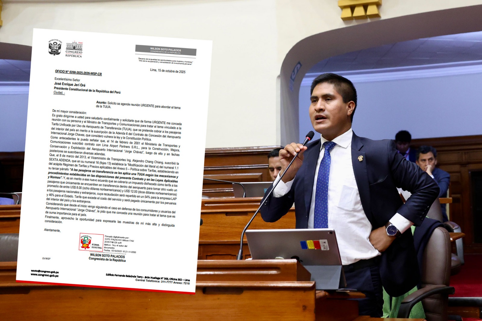 El congresista Wilson Soto Palacios envió un oficio al presidente de la República, José Enrique Jerí Oré, solicitando una reunión urgente con su despacho y con el ministro de Transportes y Comunicaciones a fin de abordar las graves implicancias de la Tarifa Unificada por Uso de Aeropuerto de Transferencia (TUUA), establecida en la Adenda N° 6 del contrato de concesión del Aeropuerto Internacional Jorge Chávez.
