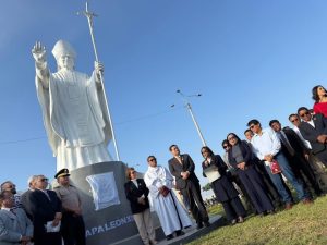 Más tarde, participó en la ceremonia de develación de la estatua en homenaje al Papa León XIV, figura emblemática para la comunidad.