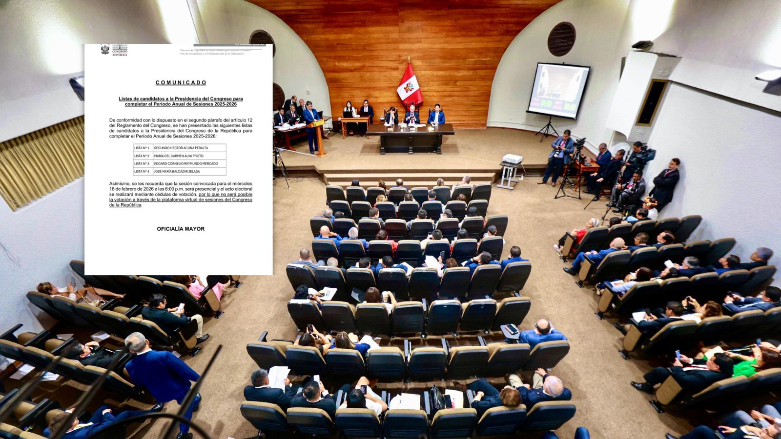 Cabe destacar que el titular del Congreso, Fernando Rospigliosi, convocó a una sesión presencial de elección de presidente del Congreso de la República, para completar el Período Anual de Sesiones 2025-2026, para este miércoles 18 de febrero de 2026, a las 6:00 p.m., en el Auditorio del Edificio José Faustino Sánchez Carrión.