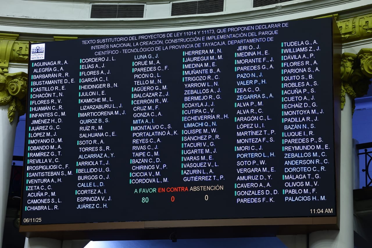 Por amplia mayoría (84 votos), el Pleno del Congreso de la República aprobó declarar de interés nacional la creación, construcción e implementación del Parque Científico-Tecnológico de la provincia de Tayacaja, en el departamento de Huancavelica, con el objetivo de fortalecer la investigación, la innovación, el desarrollo tecnológico, el capital humano en investigación, la transferencia tecnológica y el aprovechamiento de las tecnologías emergentes.