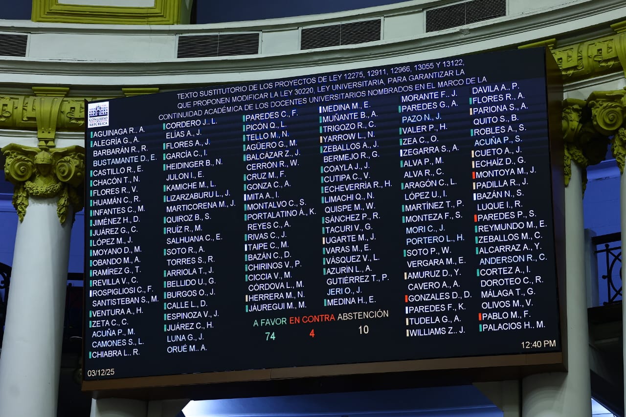 Por amplia mayoría (84 votos a favor, 4 en contra y 10 abstenciones), el Pleno del Congreso aprobó el dictamen que modifica la Ley 30220, Ley Universitaria, para garantizar la continuidad académica de los docentes universitarios nombrados bajo el marco de la derogada Ley 23733.