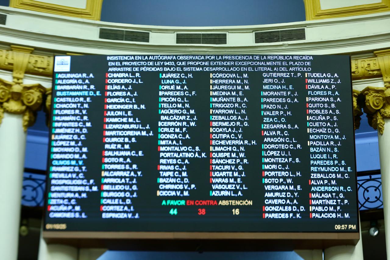 El Parlamento Nacional no aprobó la insistencia la autógrafa que propone la ley que extiende excepcionalmente el plazo de arrastre de pérdidas bajo el sistema desarrollado en el literal a) del artículo 50 del Decreto Legislativo 774, Ley del Impuesto a la Renta, y que fuera observada por la presidenta de la república.