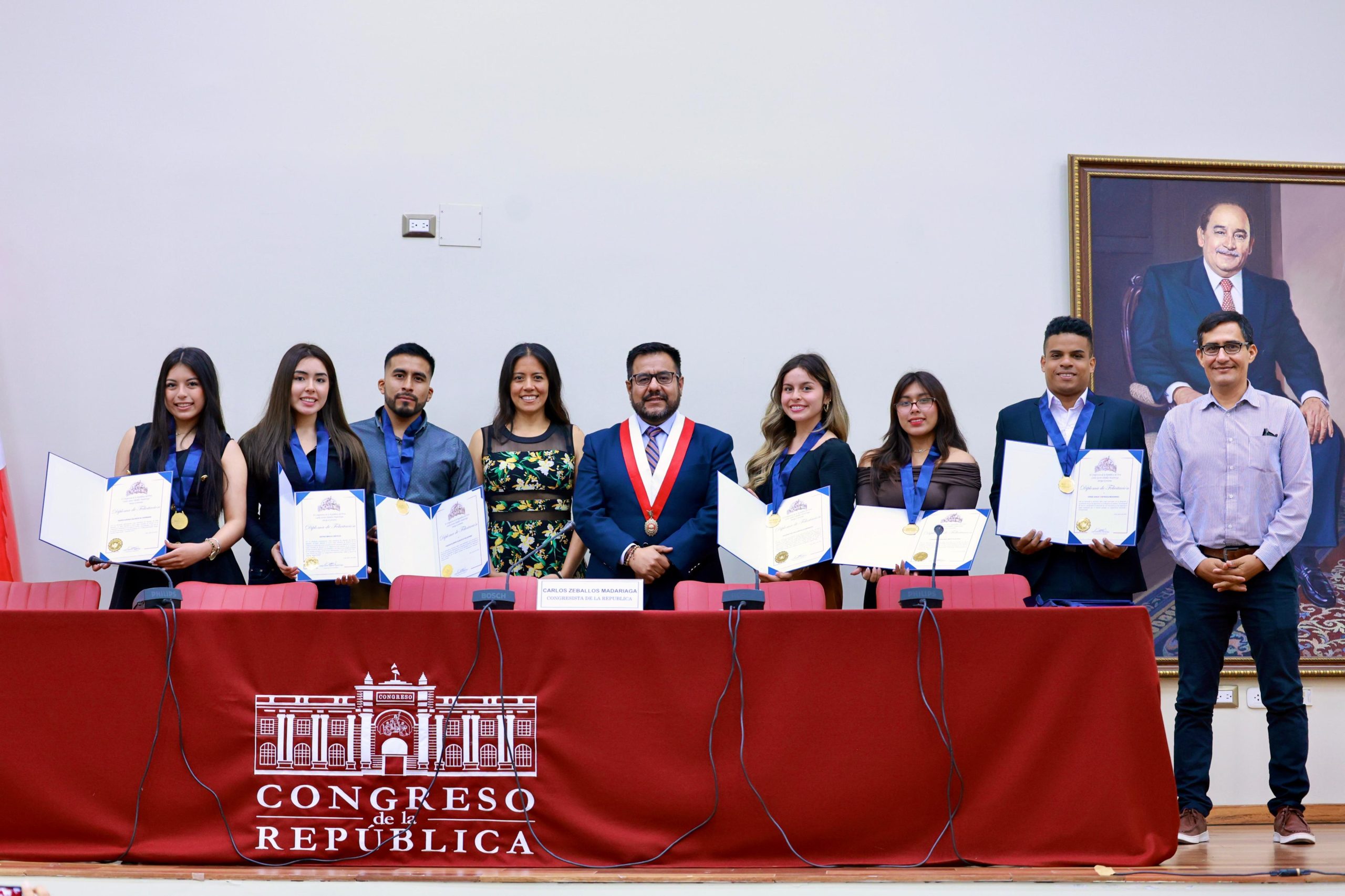 En una ceremonia realizada en el auditorio Alberto Andrade del edificio Juan Santos Atahualpa, el congresista Carlos Zeballos Madariaga (Bloque Democrático Popular) distinguió, con medallas y diplomas, a destacados deportistas y entrenadores de esgrima por sus logros nacionales e internacionales.